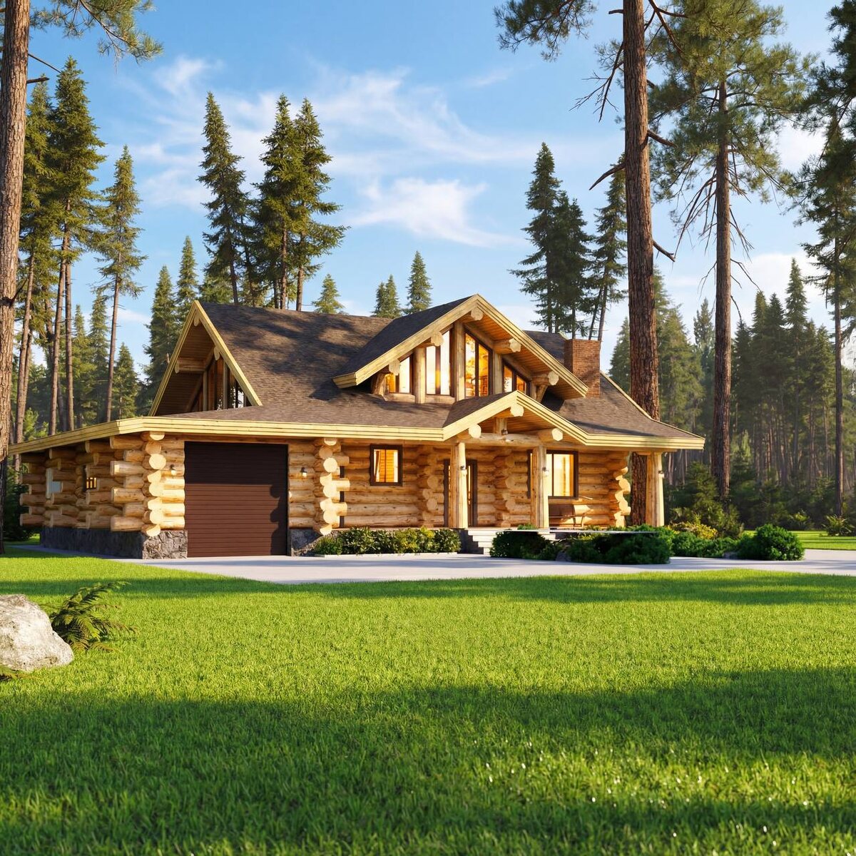 Проект двухэтажного дома с гаражом ручной рубки из кедра