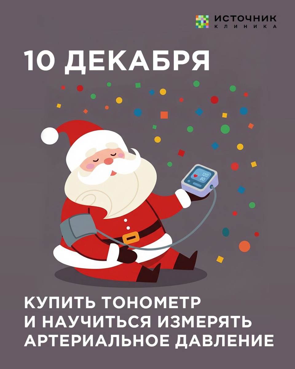 Продолжаем листать наш адвент-календарь🌲 Взять давление под контроль никогда не рано. Особенно если близкие родственники страдали от сердечно-сосудистых болезней. Покупка надёжного тонометра - это инвестиция в здоровье всей семьи. Главное - правильно им пользоваться: ✅лучше сесть, не скрещивая ноги, рука должна находиться на уровне сердца; ✅воздуховодная трубка манжеты должна быть над артерией; ✅манжета не должна быть поверх одежды, слишком давить или слабо прилегать; ✅после приема пищи должно пройти не меньше 1,5-2 часов, а незадолго до измерения давления нельзя принимать алкоголь, курить, пить крепкий чай и кофе; ✅давление нужно измерять молча. Если давление "скачет", самое время показаться кардиологу. В клинике "Источник" вы можете сделать ЭКГ (в том числе, исследование по Холтеру) и обсудить результаты на приеме у врача. 🔶А ещё есть специальное предложение: ЭКГ+прием кардиолога по специальной цене - всего за 5300₽. ☎️Звоните: +7(812) 565-19-28