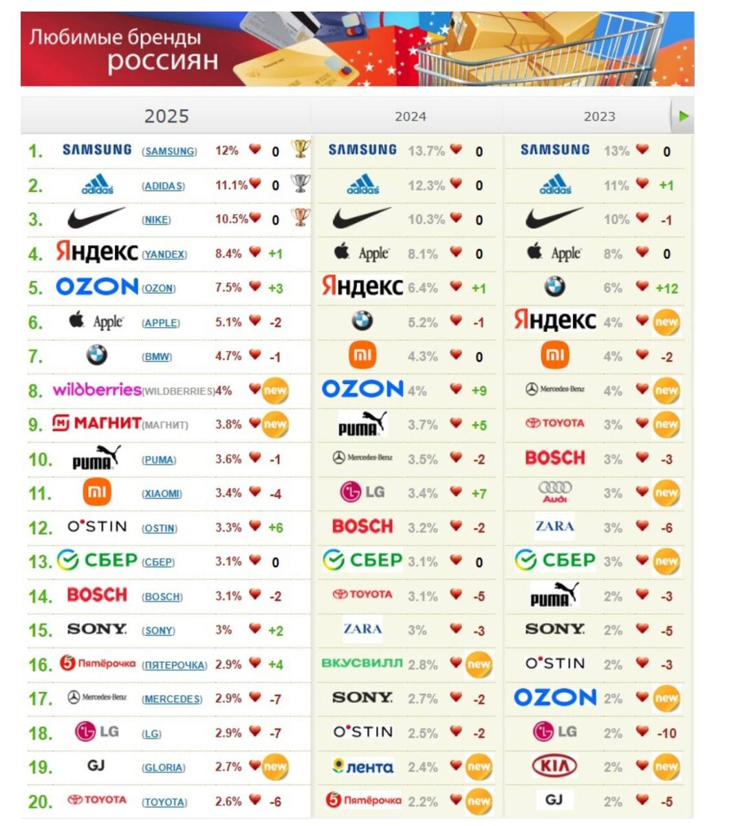 ⚡Любимые бренды россиян в 2025 году по версии OMI: в топ-10 вошёл Wildberries, Яндекс поднялся на 4 место, Ozon вошел в топ-5