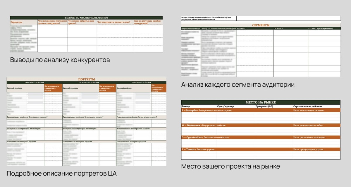 1. К каждому этапу стратегии (анализ ЦА, контент, продвижение...) есть готовый шаблон, заполняете их по порядку