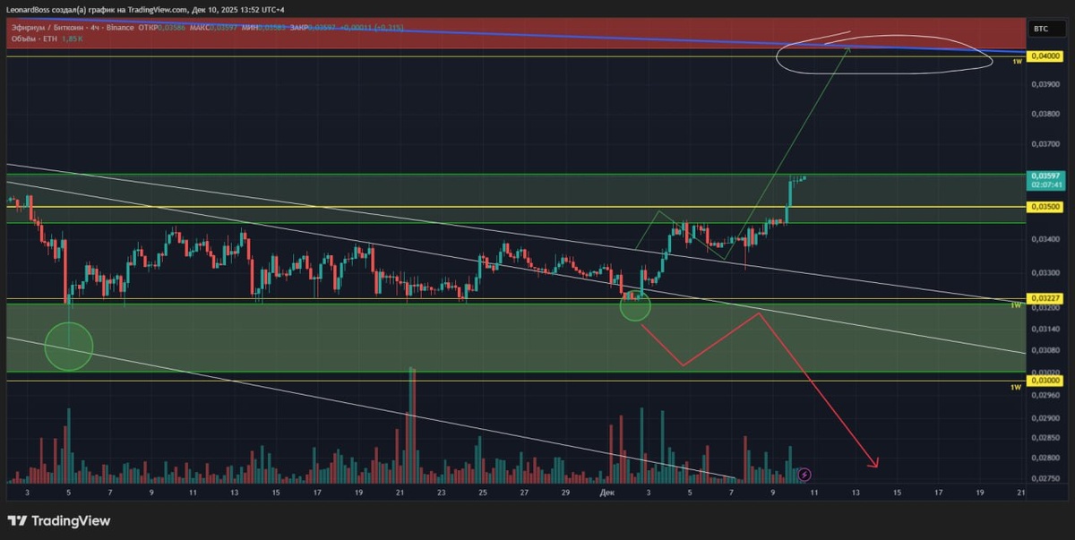 В ответ на пост #ETH 🔼🔼🔼 ⚠️Итак, коллеги, по эфиру, кто пропустил прикрепленный пост, смотрите и фиксируйте, как четко отработал 1й вариант (сценарий) на графике ETH/BTC (1й график). Идеально через ретест верхней границы блока поддержки = подтверждение покупателя и перелива ликвидности в ETH. При этом, пробита основная трендовая сопротивления и важный уровень 0,035, о котором сказал вчера = важно закрепиться ближайшими днями над блоком!! ⚠️Далее, сам эфир (2й график) дневной ТФ. Мощный выход от блока поддержки + растущие объемы. Вчерашняя дневная свеча перекрыла ближайший локальный HI более, чем половиной тела = сильный позитив на продолжение роста! Прямо над головой у эфира 3D блок сопротивления с уровнем 3400$ который при пробое откроет путь к 3800$. Но, именно тут может быть краткосрочная засада, поскольку в этой же зоне проходит старинная трендовая, от которой можем увидеть откат на перезарядку и стряхивания плечей, перед дальнейшим ростом!! P.s. на фоне общего страха, отсут