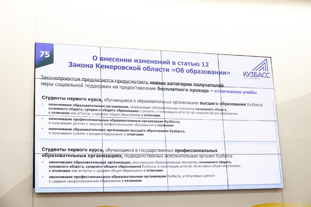 По инициативе Губернатора Кузбасса Ильи Середюка областные депутаты внесли изменения в региональный закон об образовании, дополнив его новыми категориями получателей меры социальной поддержки в виде бесплатного проезда в общественном транспорте. Напомним, что в регионе действует губернаторская программа поддержки талантливой молодежи «Лига отличников Кузбасса». В сообщество талантливой молодежи входят более 26 тысяч отличников в школах, колледжах и вузах. Ранее право на бесплатный проезд в общественном транспорте получили кузбасские школьники со второго по 11 классы, а также кузбасские студенты, которые по всем учебным предметам по итогам промежуточных (итоговых) аттестаций имеют отметку «отлично». В соответствии с принятыми сегодня поправками право на бесплатный проезд также получили следующие категории отличников учебы: – обучающиеся очно первокурсники кузбасских вузов, колледжей и техникумов при условии, если до поступления они с отличием окончили кузбасское образовательное учрежд