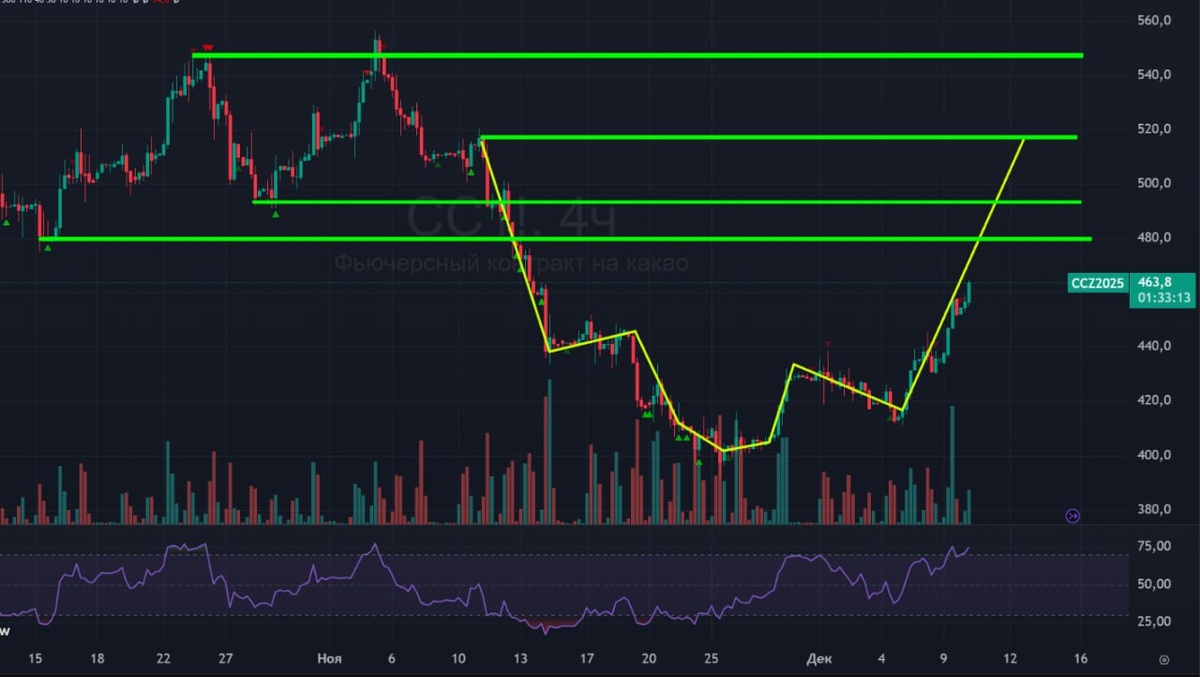 ☕️ Какао: обновление графика. 🟢 Идем по плану - рисуем ПГИП с целью на 520. 16го декабря у текущего контракта экспирация, так что на новом фьючерсном графике мы окажемся примерно на 30 баксов выше, и сразу очутимся вблизи зеленых линий сопротивлений. 🚗 По прежнему ожидаю какао вверх, цели еще не добиты. #какао #cc1 #cocoa #bogdanoffinvest $CCH6