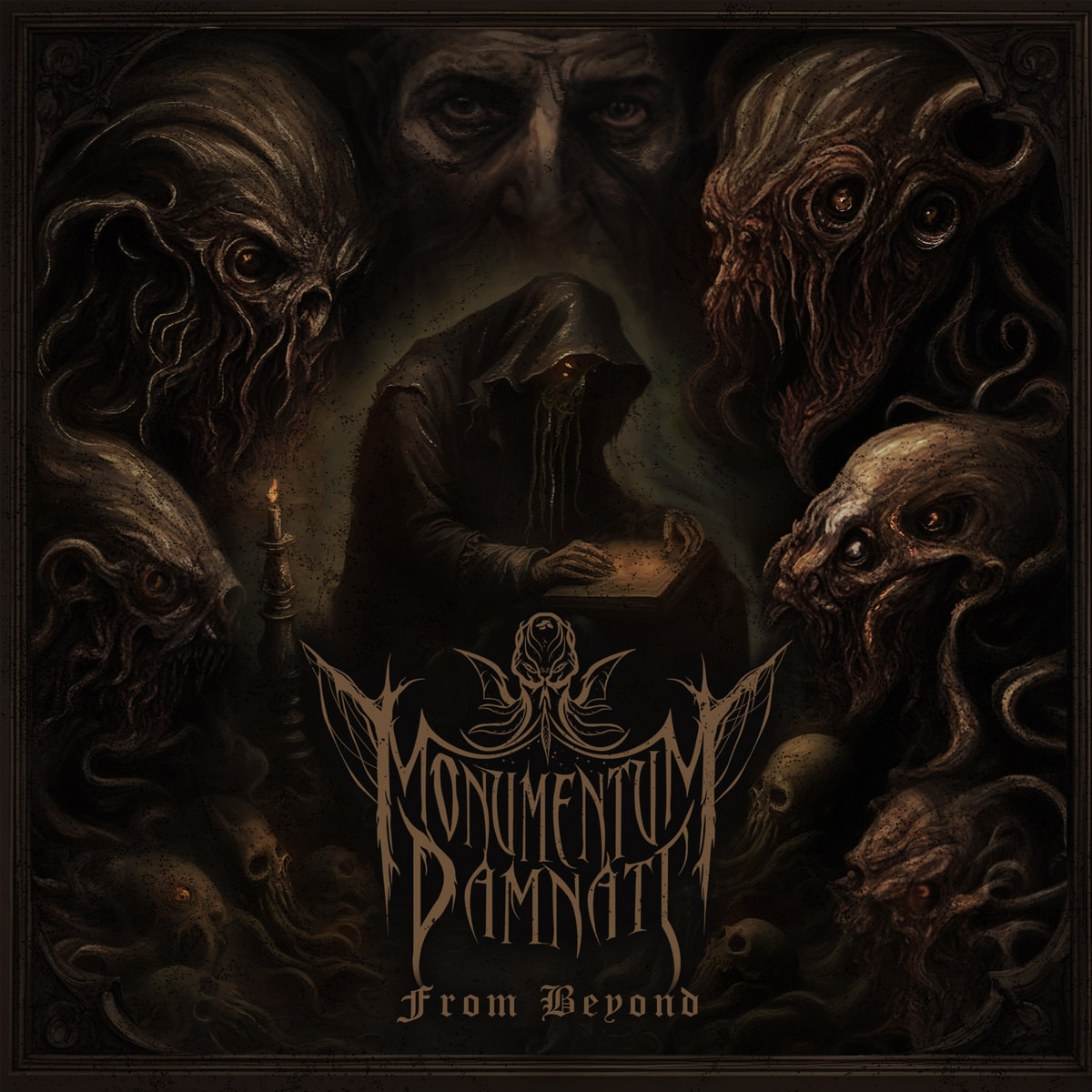 Автор: Николай Чувиков Создалось ощущение, что после дебютного “In The Tomb Of A Forgotten King” Monumentum Damnati просто-напросто исчезли — так же буднично, как туман после дождя. Однако на самом деле проект этот никуда не делся: он тихо рос и насыщался жизненными соками в своём готическом подполье. За эти годы проект перестал быть международным и теперь значится как белорусский, а дуэт музыкантов (композитор Abhoth и вокалист Thanatos) решил, что рамки Death Doom-а тесноваты для их амбиций. Новый альбом “From Beyond” получился заметно злее, быстрее и чернее, чем дебют: будто кто-то выключил свечи, открыл подпол, а оттуда в студию прокралось нечто со щупальцами и потребовало добавить бластбитов. Концепция здесь простая, как хороший страшный сон: каждая композиция — это отдельный рассказ, вытащенный из влажной и тёмной почвы викторианского хоррора. От “Rats in the Walls” до “The Shadow Out Of Time” — это путешествие по знакомым мифам, где стены шепчут, а ночной кошмар повелевает. Г