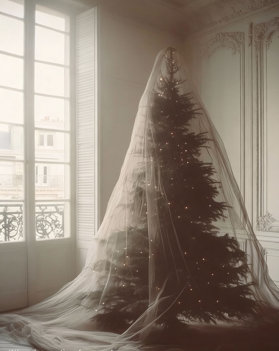 Забудьте о стандартной звезде или ангеле. Главный фетиш сезона 2025, который уже вовсю готовят к 2026, — «Ёлка-Невеста». Что это? Представьте: ваша пушистая красавица (искусственная или живая) накрыта легчайшей вуалью, тюлем или кружевной тканью, как фатой. Эффект — замирающий, нежный, сказочный. Как повторить? (Практично, как мы любим): Выбираем ткань: воздушный фатин, гипюр, сетка с серебристой нитью. Цвет — белый, сливочный, ледяной серебристый. Крепим изящно: не набрасываем, а создаём драпировку. Закрепите ткань на самой верхушке булавкой или красивой брошью, а затем дайте ей ниспадать мягкими складками. Дополня