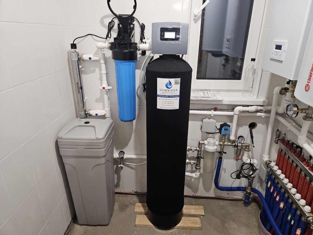 Решаем комплексно: железо, жесткость и микробиология. История одного монтажа 🚰 «Наша задача - не просто продать фильтр, а подобрать решение, которое устранит именно ваши проблемы с водой». Недавно мы завершили монтаж системы для загородного дома в д. Толмачево Лужского района. Шаг 1: Диагностика. Начали с нашего стандартного анализа воды за 5000 ₽. Результат показал комплекс проблем: ➖ Превышение по железу (рыжий подтёк, металлический привкус) ➖ Высокая жесткость (накипь на чайнике, сухость кожи) ➖ Превышение по марганцу (сероватый оттенок воды) Шаг 2: Подбор оборудования Для такой воды есть оптимальное решение: Управляющий клапан SW-Space — «мозг» системы. Автоматически управляет промывками, обеспечивает бесперебойную работу и экономит воду. И да, на него — гарантия 2 года. Многофункциональная очистка - специальные фильтрующие среды для удаления железа, марганца и солей жесткости. УФ-стерилизатор - финальный и важнейший штрих. Обеззараживает воду, уничтожая 99,9% бактерий и ви