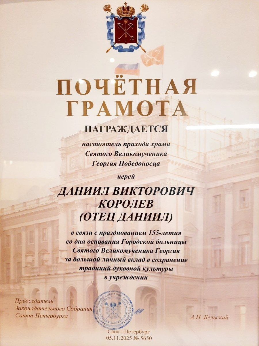 В ответ на пост Почетная грамота настоятелю нашего храма иерею Даниилу от председателя Законодательного собрания СПб.