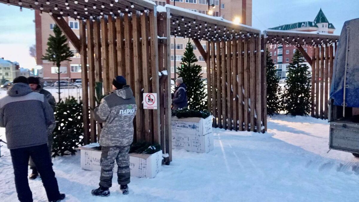 У "Парков" всё по плану, уже третий день идёт работа над монтажом гирлянд-лампочек на конструкциях для светодиодных качелей