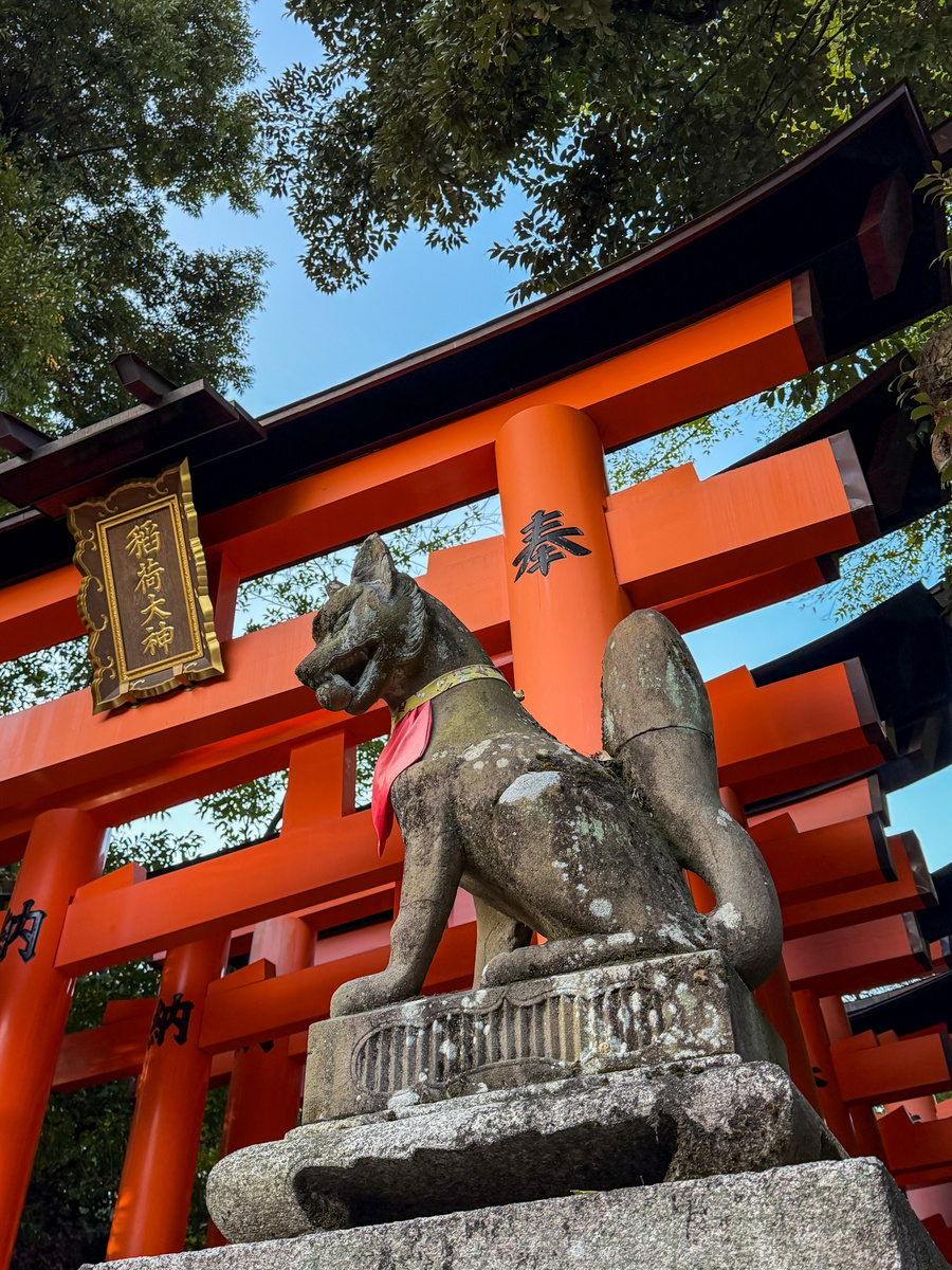 Фусими Инари – это просто какое-то невероятное место! Во-первых, именно тут находятся почти все туристы, а во-вторых, даже толпы людей не мешают восторгаться лабиринтами красочных торий. Святилище посвящено божеству Инари – синтоистскому богу риса и плодородия в Японии. Со временем роль божества расширилась, и теперь Инари ассоциируется с успехом в бизнесе, торговле, финансах и промышленности. Его посланниками являются лисы (кицунэ), поэтому на территории храма можно увидеть множество различных статуй лис. Часто кицунэ украшены нагрудниками, приносимыми в знак почитания. Одним из атрибутов кицунэ является ключ (говорят, что от рисового зернохранилища) и драгоценный камень, которые лисицы держат в своей пасти. Считается, что Фусими Инари имеет древнее происхождение, ещё до переноса столицы в Киото в 794 году. Самые старые постройки датировались 711 годом, но вполне вероятно, что храм ещё старше. Туристы сюда приезжают увидеть лабиринты торий. Здесь их установлено более 10 тысяч. Тории