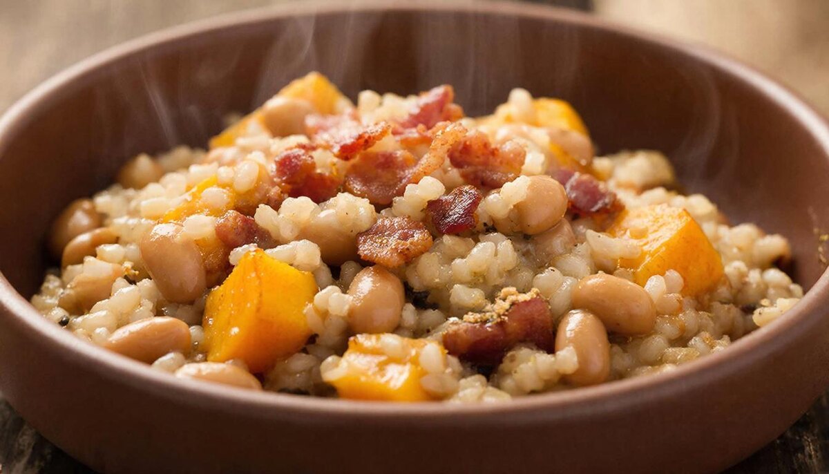 Отличная идея для сытного, ароматного и очень осеннего/зимнего блюда! Перловая каша с фасолью, тыквой и беконом – это полноценный обед или ужин, богатый вкусами и текстурами. Бекон придаст копченые нотки и жирность, тыква – сладость и нежность, фасоль – белковую составляющую и приятную рассыпчатость, а перловка – основу и характерную плотную текстуру. Давайте приготовим! Перловая Каша с Фасолью, Тыквой и Беконом Время подготовки: 8 12 часов (на замачивание перловки) + 20 минут Время приготовления: 50 70 минут Выход: 4 6 порций Ингредиенты: Для перловки: 1 стакан (200 г) перловой крупы 2 3 стакана воды или бульона (для варки перловки) Остальные ингредиенты: 150 200 г бекона (сырокопченого), нарезанного кубиками 300 400 г тыквы, очищенной от кожуры и семян, нарезанной кубиками (1.5 2 см) 1 банка (400 г) консервированной белой или красной фасоли (без томата), промытой и откинутой на дуршлаг 1 крупная луковица, мелко нарезанная 2 3 зубчика чеснока, измельченных 1 ч.л. сушеного тимь