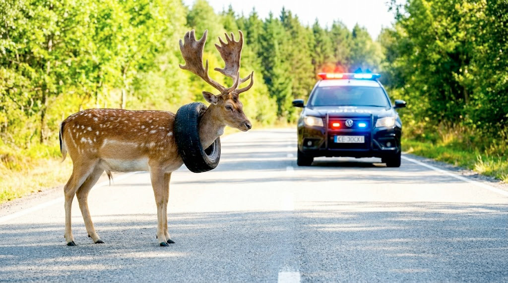 Я медленно вышел из машины и подошёл ближе. В этот момент у меня буквально похолодело внутри: на шее у оленя, как ошейник, сидела автомобильная шина. Огромные ветвистые рога, красивое животное — и эта чёрная, чужеродная штука, глубоко врезавшаяся в шею.