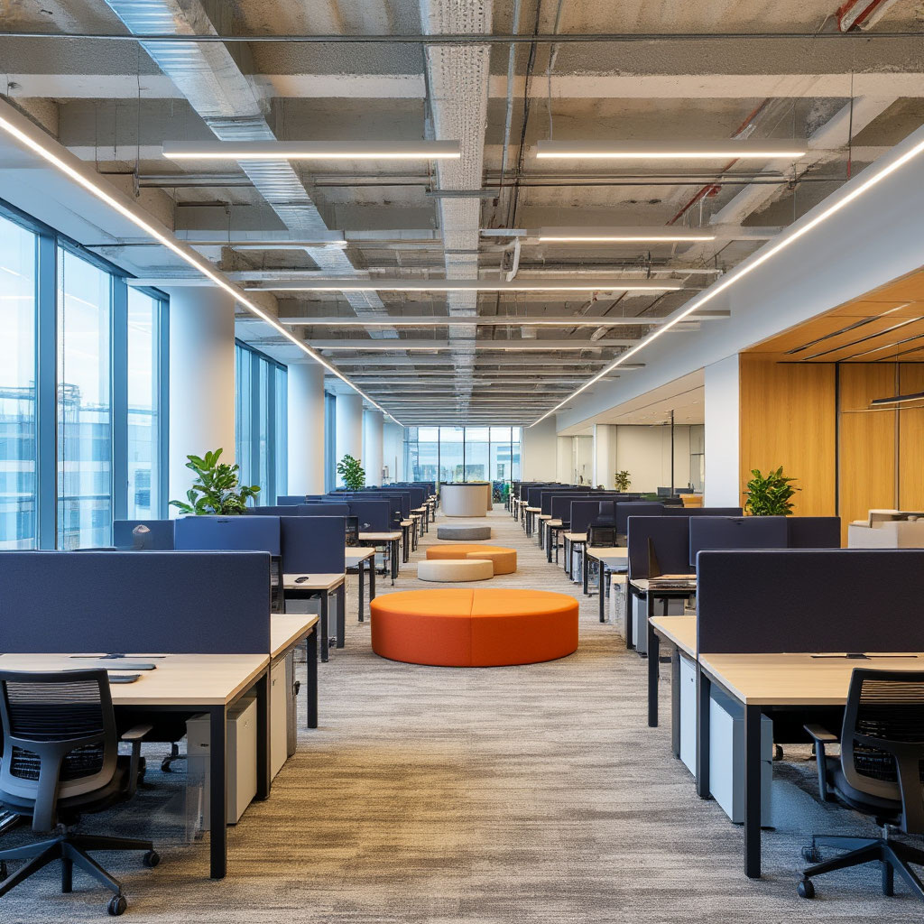 Освещение — только человекоцентричное. Нет холодных люминесцентных ламп. Только тёплый свет, максимально приближенный к солнечному. Над каждым рабочим местом — индивидуальный светильник с регулируемой яркостью.