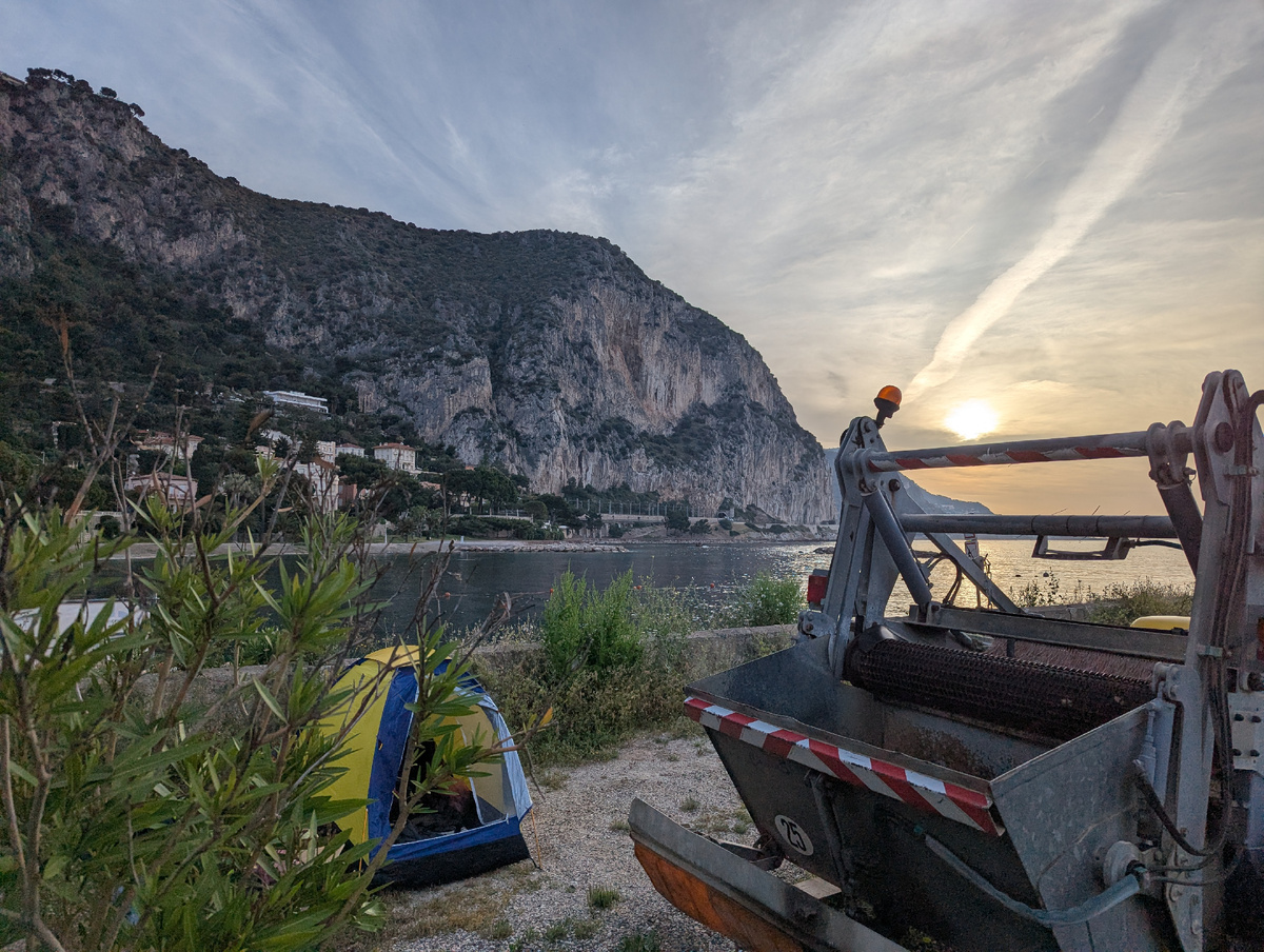 Продолжение рассказа. Начало тут: После реки Агэй начинается уже Галлия Цизальпийская. Места эти мне очень знакомы - неоднократно путешествовали мы там с детьми, с попутчиками. Все мои путешествия там - исключительно с палаткой и все бомжовские места от Генуи до Сен-Тропе мне отлично известны, поэтому голова у меня не была занята хозяйственными вопросами, и я предавался созерцанию. Очередной отель "романыЧ" на Лазурном Берегу - возле моря, с туалетом: Впереди Монако, который мы много раз проезжали, и я решил не путаться в тамошних улицах. а объехать город поверху Есть хотелось всё больше, и я поспешил в Италию, где цены на еду в продмаге вдвое ниже, чем во Франции. Перекусив, запасшись снедью, я отправился на поезде вверх по долине реки Ройя, чтобы переночевать возле городка Саорж и наутро отправиться в путь вниз. Станция Фонтан - очень уютная для ночёвки Саорж - удивительный городок. Там нет горизонтальных поверхностей (ну кроме столов в кафе) и дядьки играют в петанк не шарами,