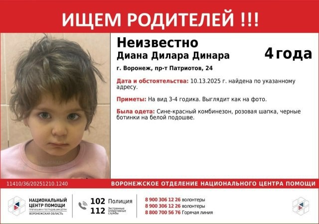 В Воронеже ищут родителей четырехлетней девочки. Ребенка обнаружили сегодня утром на проспекте Патриотов. Малышка была одна и назвала свое имя — Дилара, Диана или Динара. Волонтеры и правоохранительные органы просят всех, кто знает семью девочки, немедленно сообщить им. Обращаются ко всем жителям города помочь в распространении информации о пропавшей девочке.
