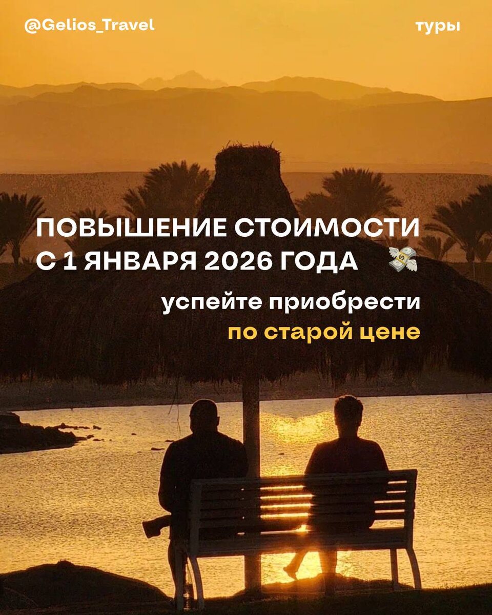 ‼️Повышение стоимости с 1 января 2026 года 🤩 Друзья, внешние условия, не зависящие от нас - меняются и нам приходится за ними следовать, чтобы сохранить качество, за которое вы нас и любите, поэтому с 1 января цены на туры Gelios Travel поднимутся 💸 Но есть и отличная возможность: в декабре вы можете успеть купить любой тур по старой цене, специально предупреждаем вас заранее Все, кто планирует путешествие с нами в 2026 году - сейчас идеальный момент для бронирования тура 🙏 С заботой, команда Gelios Travel