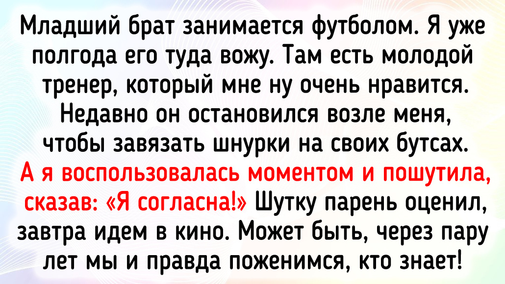 Шутку можно считать удачной, когда над ней смеются ее автор и ее объект. Но как реагировать невесте, если вдруг в загсе жених-юморист выкидывает нечто эдакое, или когда близкий человек дарит вам животное, которого вы побаиваетесь? О нелепых розыгрышах рассказали герои этой подборки. Устроилась я на работу. Один коллега сходу стал надо мной колко подшучивать, но я не обращала внимания. И вот на той неделе он неожиданно заявил: «Ксюх, сколько еще мне тебя обхаживать?» Ага, думаю, снова ду*ацкая шутка, и игнорю его. А этот крендель выдал: «Тебе же, как и всем девушкам, нравится наглость, вот я и пытался так подкатить!» Может, я устарела и чего-то не понимаю в современных подкатах... Женится мой товарищ. В загсе ведущая церемонии спрашивает его: «Согласны ли вы взять в жены...» — ну и так далее. А тот выдал: «Да, но при одном условии...» Все замерли, ведущая не растерялась и спросила, мол, при каком? А он, показав рукой на невесту, сказал: «Если она никогда-никогда не будет спать в бигуди