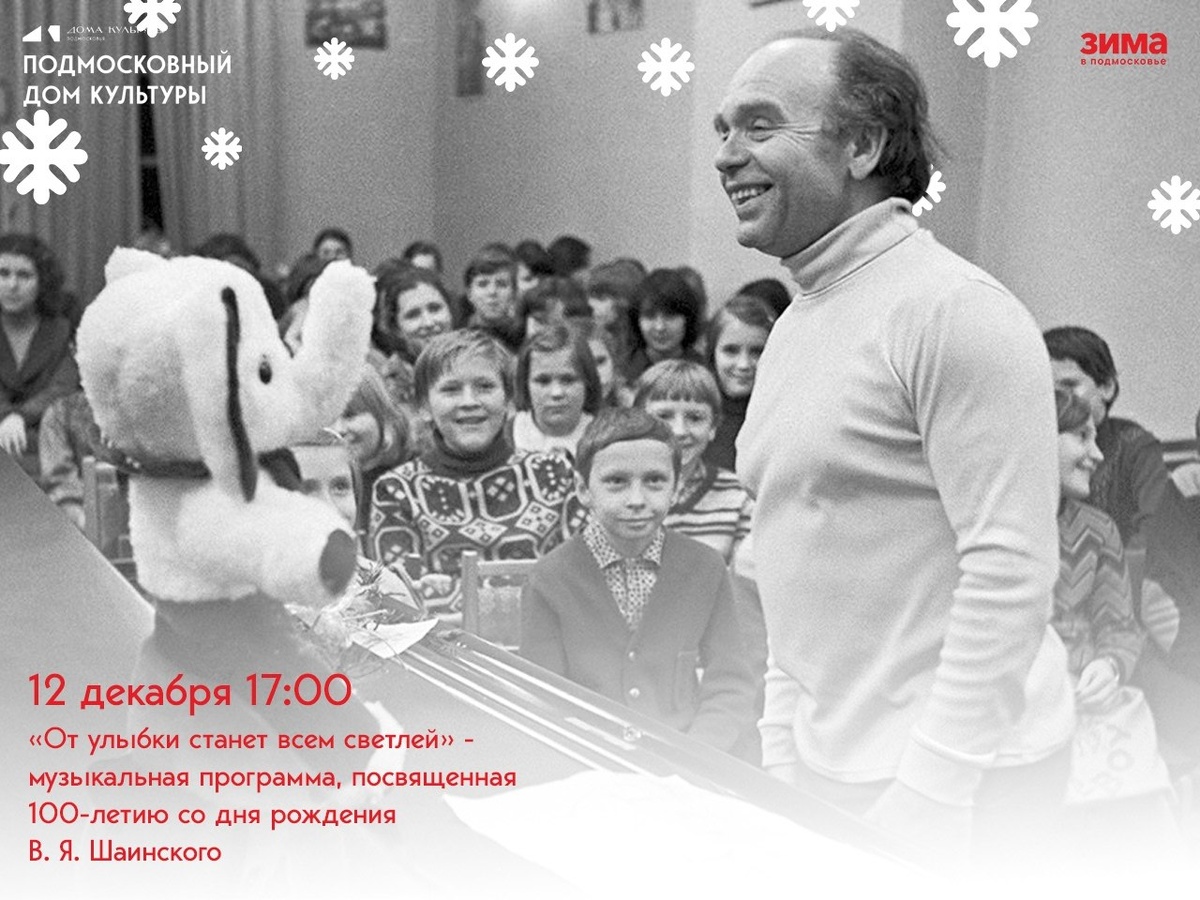 ✨ «Мысли приходят мне в голову где угодно, но только они должны быть музыкальными. Тогда и появляется мелодия».✨ Приглашаем вас окунуться в магию музыки 12 декабря в 17:00 на музыкальной программе «От улыбки станет всем светлей», посвящённой 100-летию со дня рождения Владимира Шаинского! 📆 12.12.2025🕒17:00 🏢 Подмосковный сельский дом культуры (СДК) 📍 г.о.Домодедово, пос.санатория Подмосковье, д.9 💰 Вход свободный❗️ ✅ Мероприятия Домодедово https://dzen.ru/id/66f10385cc4c5a16f7b5fb02 http://vk.com/domodedovo_events http://dzen.ru/domodedovo_events