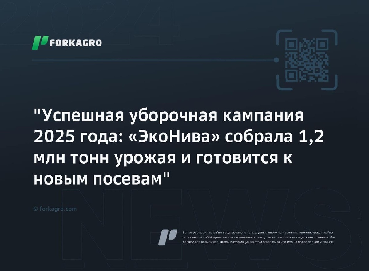 "Успешная уборочная кампания 2025 года: «ЭкоНива» собрала 1,2 млн тонн урожая и готовится к новым посевам