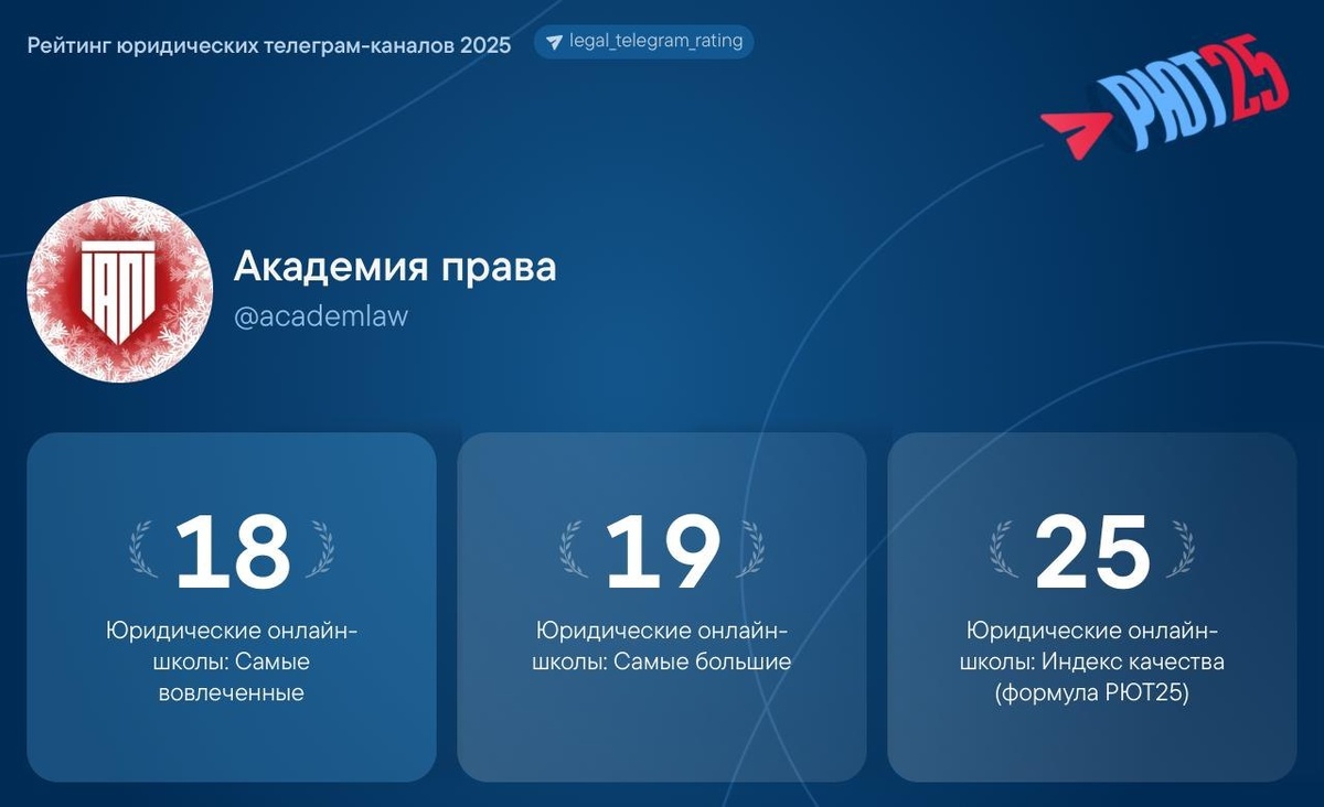 🔝Подписчики Академии права, вы самые вовлеченные в списке первых 20 юр каналов! Благодаря Вам мы заняли 18 место среди самых вовлеченных юридических онлайн-школ рейтинга РЮТ25. Хоть мы и не онлайн-школа, а журнал и сообщество, Академия права гордится быть признанной образовательным проектом. Если еще не знаете, что такое Рейтинг юридических тг-каналов 👉 ссылка ✍️ Академия права больше чем журнал