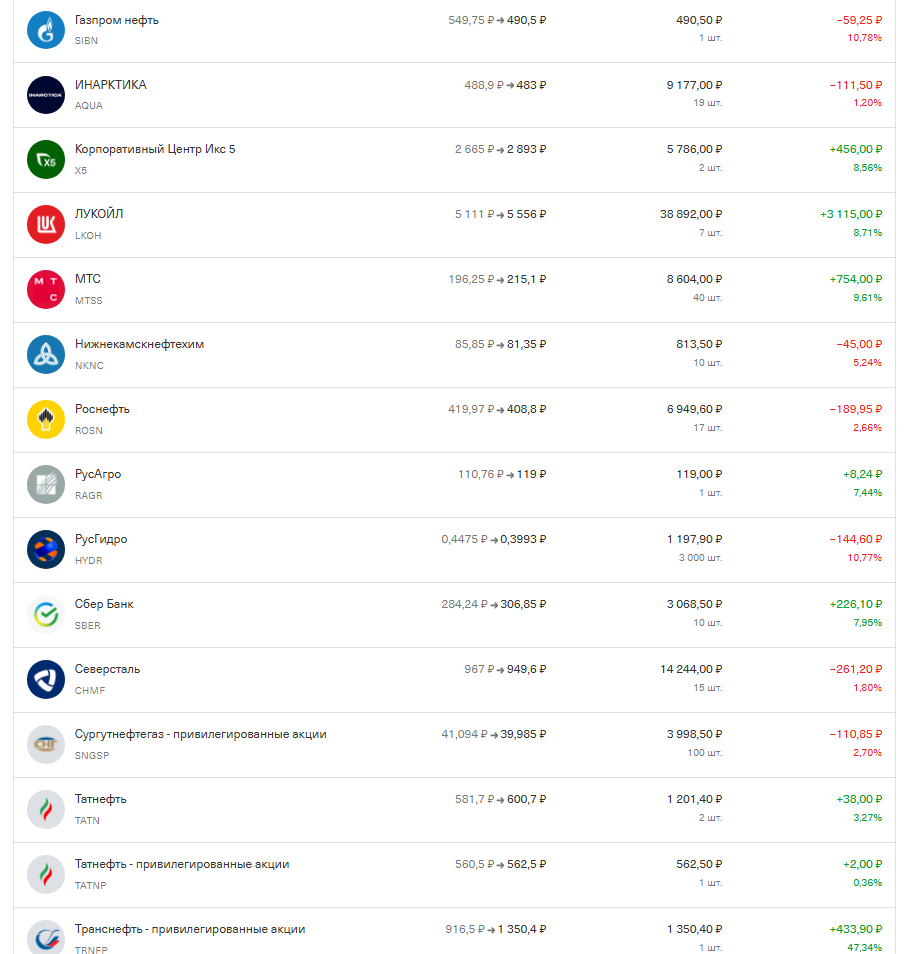 Почему рановато - потому что, судя по всему, до конца года я до акций всяких не доберусь уже. Надо где-то найти на ПДС еще 15 тыщ, Новый Год, подарки, всё вот это вот. Не до акций в общем с облигациями. Тем более что недурно вышло то. В общем вот Это прям полный мой портфель на данный момент. Всего туда внесено 85 тыщ, сейчас активов на 96 тыщ, с учетом того, что по низу рынка. В смысле рынок в низах. Лукойлом и икс пять я закупился, на долгосрок в моем понимании - инарктика, северсталь и сбер тоже удачно прикуплено, сургутнефтегаз тоже, роснефть еще. В общем я считаю что на средне-долгосрок норм портфельчик. Танефти маловато, да. Ну да поглядим. В следующем году как пойдет, будет также или ниже - буду докупить свои вот эти вот, лукойлы с МТСами и сберы с северсталями. И татнефти, реально маловато чего-то. БУдет выше - поглядим чего там с облигациями. Или те же татнефти буду докупать. Ну две это как-то несерьезно. А если нефти будут расти - то инарктики. Пока то они точно что расти н