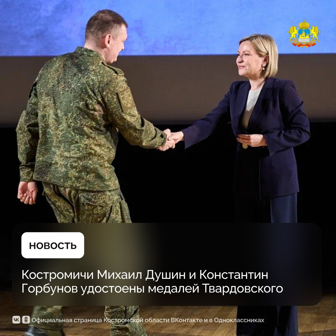 Медаль имени Александра Твардовского за существенный вклад в реализацию творческих проектов в условиях военных действий и при других обстоятельствах, сопряжённых с риском для жизни, укрепление нравственных ориентиров общества учреждена в этом году. В числе первых 35 награждённых — костромичи Михаил Душин и Константин Горбунов. Поэт, руководитель исполкома Костромского реготделения Партии «Единая Россия» Михаил Душин был призван на фронт в рамках частичной мобилизации. Ранее неоднократно ездил в зону специальной военной операции, в составе литературной бригады читал стихи для военнослужащих. Сейчас служит в 348 мотострелковом полку и продолжает писать стихи. Избран депутатом Костромской областной Думы. Художник Константин Горбунов возглавляет артбригаду «С.В.О.И.», которая сформировалась после призыва губернатора Сергея Ситникова к деятелям искусства обратить своё творчество к теме специальной военной операции и уже дважды побывала на передовой, чтобы запечатлеть героизм наших военнослу