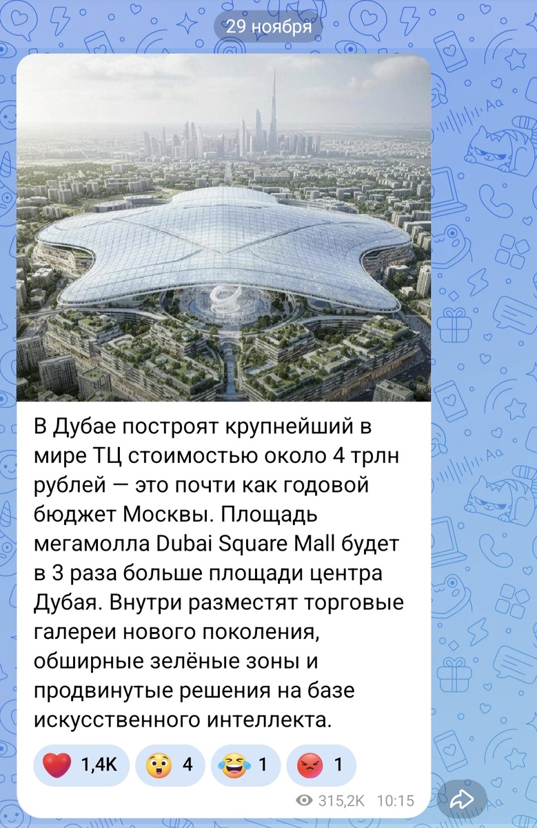 Новость, которая не отпускает меня уже вторую неделю. Только недавно писала об огромнейшем торговом центре в Дубае, и вот прилетает новость о том, что будет построен новый гигант для шопинга там же. Много разных мыслей вызывает такое строительство. Поделюсь двумя основнымм моментами. Во-первых, очень грустно, что люди, которые обладают такими ресурсами тратят их столь бесполезно для общества. В мире есть столько важных и насущных проблем, которые бы эти 4 трл рублей могли решить. Экология, медицина, наука, космос - каждая из этих областей могла бы получить чуть больше развития за счет этих средств. Я прекрасно осознаю, что развитие этих областей не принесет такой бешенной прибыли, которую инвесторы получат от нового ТЦ. Но что-то мне подсказывает, что у этих людей уже давно закрыты все базовые потребности и есть другие источники дохода. Когда сверхобеспеченные люди начнут думать не только о себе и своих карманах, возможно, у человечества появится шанс. Но это была только перва