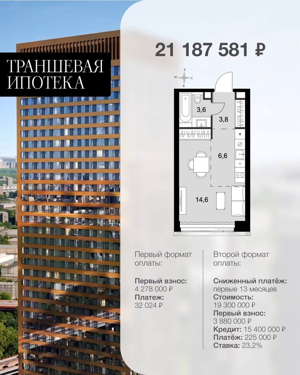 Траншевая ипотека - доступна абсолютна всем категориям граждан Студия 28.6 м² Срок сдачи: 3 квартал 2027 Первый формат оплаты: Первый взнос: 4 278 000 ₽ Платёж: 32 024 ₽ Стоимость: 21 187 581 ₽ Второй формат оплаты Сниженный платёж на первые 13 месяцев Стоимость: 19 300 000 ₽ Первый взнос: 3 880 000 ₽ Кредит: 15 400 000 ₽ Платёж: 225 000 ₽ Ставка: 23,2% ❤️Отделка White Box ❤️Проходная кухня-гостиная ❤️Линейная кухня ❤️Гибкая планировка ❤️Увеличенная ширина окна/окон ❤️Ниша под шкаф ❤️Вид на город ❤️Линейная ❤️Можно оборудовать рабочее место Пиши ❤️ @ipoteka_malkhasyan13