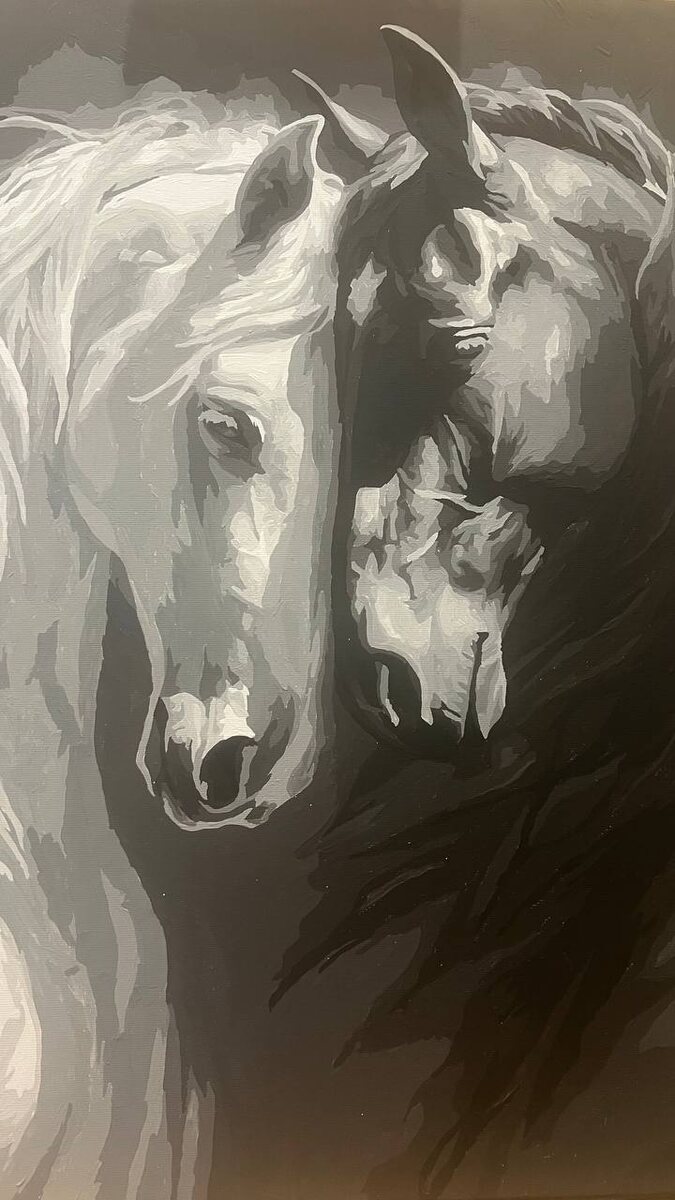 Еще рисовала картину по номерам, очень сложная оказалась из-за того, что мало цветов использовалось, все черно бело серое…