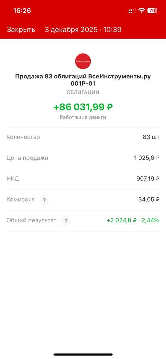 Хороший конец 👋 Продал по оферте еще одну облигацию. Завершилась история с ВсеИнструменты 001Р-01 Оферта была внеочередная, выкупали с апсайдом в 2,3%, поэтому принял решение продать и переложиться в более долгосрочную историю. За 1,5 года актив принес 35% или 21,2% годовых на руки. Приятная сумма, в отличии от моей доходности по акциям 😁 Перекладывать буду в 2-х 3-х летние истории. Рассматриваю эмитентов с рейтингом А- и предсказуемой историей на горизонте. С февраля по март следующего года, у меня амортизируются облигации на 2кк, вот тут надо подумать 🤔