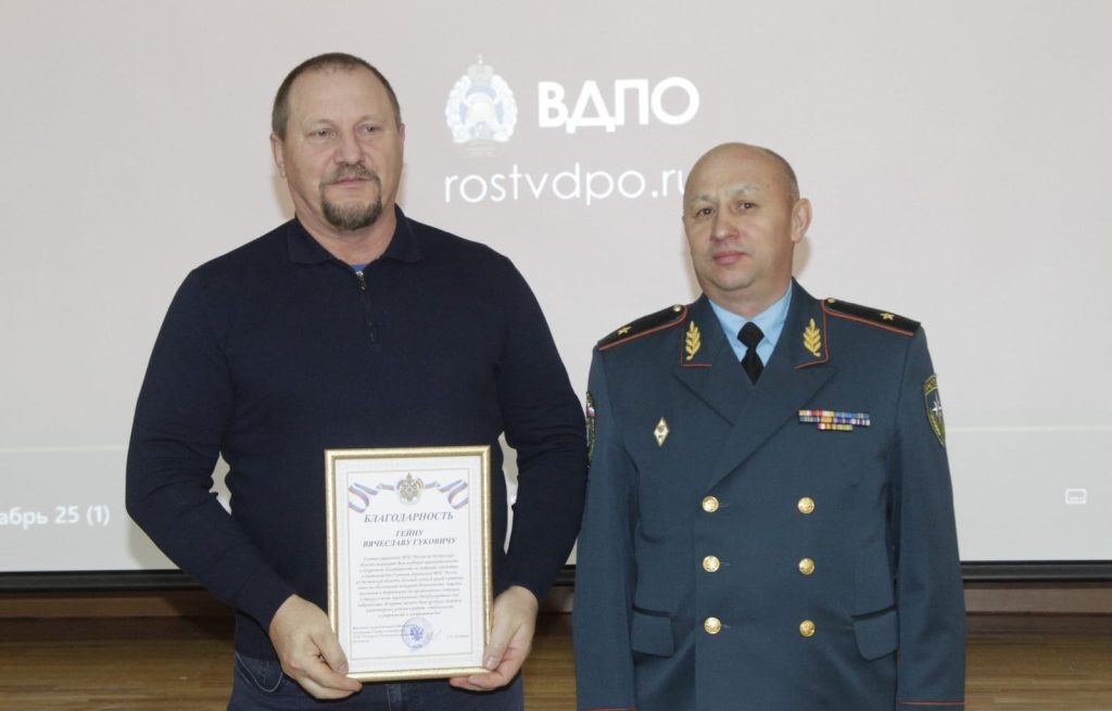 В учебно-методическом центре по ГО и ЧС Ростовской области в канун Международного дня добровольца чествовали тех, чей выбор – быть на передовой в борьбе с огненной стихией без оглядки на награды. В мероприятии приняли участие руководители советов ВДПО и самые отличившиеся добровольные пожарные со всей области. Среди них –представители Цимлянского района — председатель местного совета ВДПО А.Н.Циринг и старший инспектор по ГО и ЧС Маркинского сельского поселения В.Г.Гейн. Вячеслава Гуковича за активное участие в профилактике и тушении пожаров наградили Благодарностью начальника ГУ МЧС России по Ростовской области. Эта награда – закономерное признание многолетнего самоотверженного труда нашего земляка. Путь пожарного-добровольца Вячеслава Гейна начался в 2015 году, когда его назначили старшим инспектором по ГО и ЧС Администрации Маркинского сельского поселения. Он сразу вступил в ряды Всероссийского добровольного пожарного общества и возглавил местную добровольную команду. С этого момент
