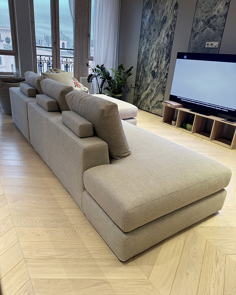 На этих кадрах — процесс комплектации интерьера квартиры в Петербурге. Пространство ещё в финальной стадии реализации, но уже чувствуется будущая атмосфера: спокойная, собранная, с акцентом на тактильность и продуманные пропорции. Мы привезли сюда два дивана из коллекции Bijoux 2.0 от Ditre Italia — один угловой, второй прямой. Лаконичная геометрия, глубокая посадка и характерная для коллекции мягкая пластика форм сразу задали ритм будущей гостиной. Обивка выполнена в рогожке — фактурной, матовой ткани, которая красиво ведёт себя в интерьере: не бликует, подчёркивает архитектуру дивана и добавляет ощущение спокойного, тихого уюта. Такой материал практичен, износостойкий и идеально подходит для ежедневного использования, сохраняя аккуратный внешний вид.