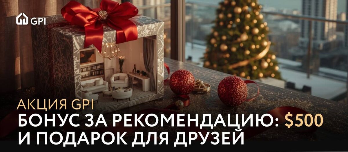 В честь приближающихся праздников GPI запускает специальную новогоднюю акцию! ☺️ Порекомендуйте нас другу до конца года — и вы оба получите наш праздничный бонус! 🥰 Что мы дарим ВАМ? Финансовый подарок в $500 сразу после успешной покупки, которую совершит ваш друг. 🥰 Что мы дарим ВАШЕМУ ДРУГУ? Целый набор праздничных преимуществ на выбор*: ✨Волшебные выходные: Бесплатное проживание в наших инвестиционных апартаментах, чтобы ощутить атмосферу будущего дома. ✨Праздничный сервис: Встреча в аэропорту и трансфер для клиентов, прилетающих на просмотр. ✨Специальная цена от застройщика по нашей партнёрской программе. ***Конкретный бонус зависит от объекта и условий сделки и согласуется персонально. Акция действует для сделок, заключённых до 31 декабря 2025 года. Пишите @sales_gpi и мы сразу предложим вам праздничные условия 🙃