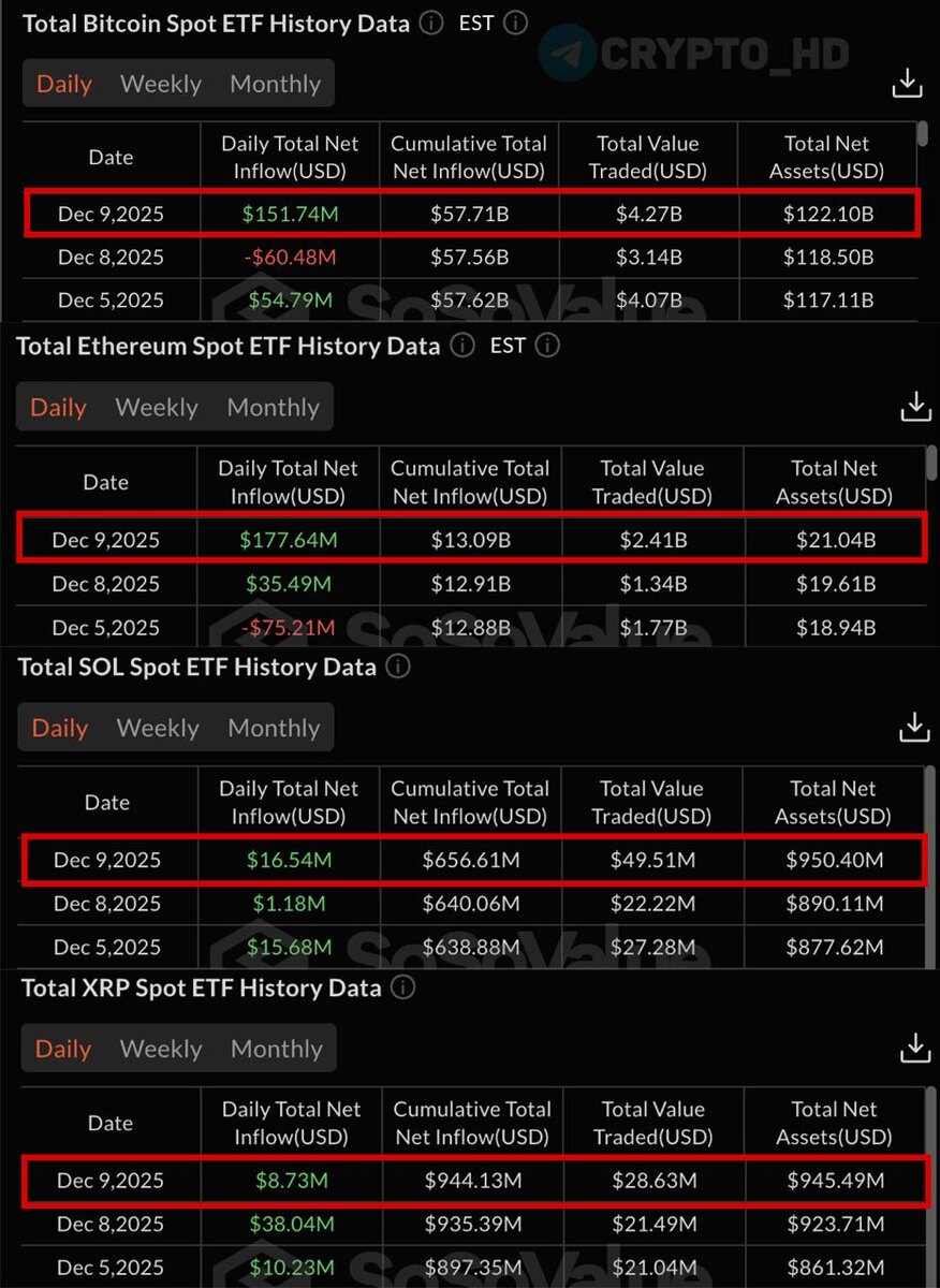 🤔 SV: Финпотоки крипто-ETF за вчерашний день. ▫️#BTC = +$151,740,000. ▫️#ETH = +$177,640,000. ▫️#SOL = +$16,540,000. ▫️#XRP = +$8,730,000 (17 зеленых дней подряд). ▫️#HBAR = +$762,250. ▫️#LINK, #DOGE, #LTC = нет данных или $0. Crypto Headlines