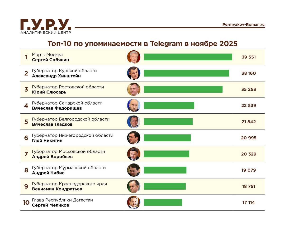 Губернатор Нижегородской области Глеб Никитин вошел в десятку самых упоминаемых в Telegram глав регионов России по итогам ноября. Такие данные опубликовал Аналитический центр "Г.У.Р.У." совместно с информационным телеграм-агентством "ТелеСтрим". За месяц в федеральных и региональных СМИ была зафиксирована почти 21 тысяча упоминаний о нижегородском губернаторе. Это позволило ему занять высокие позиции в медиарейтинге (6-е место). В тройку лидеров вошли мэр Москвы Сергей Собянин, а также губернатор Курской Области Александр Хинтштейн и глава Ростовской области Юрий Слюсарь. К числу ключевых информационных поводов эксперты отнесли празднование Дня народного единства в Нижнем Новгороде, а также отправку гуманитарного груза в зону специальной военной операции. Значительное внимание СМИ привлекла и традиционная прямая линия, на которой Глеб Никитин отвечал на вопросы жителей региона. Еще одним заметным событием стало участие губернатора и помощника президента России Владимира Мединского в за