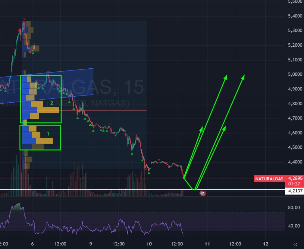 В ответ на пост ⛽️ ГАЗ 🟢Во-превых, немного поинфоцыганю: я ждал газ с лета на 5, и он туда пришел, дальше я сказал, что тренд окончен и с тех пор укатались на целый бакс вниз. 🟢Вот-вторых: в прошлом посте было два варианта вниз - пошли по зеленому, без формирования второй вершины, но такая вероятность все еще существует 🟢Теперь перейдем к текущей картинке: прямо сейчас разворотного сетапа нет, но мы подходим к сильной поддержке 4,2137, газ пролетел 20% вниз, и как правило, на этом этапе лопаются котлетчики, которые залетели на самых хаях, перевоачиваются тут в шорт, после чего график сразу же разворачивается. 🚗 Так что я жду разворот прямо отсюда. Крайний случай - от поддержки. Если бы я был ММ, я бы не тянул до поддержки, так как ее видят все, и шортисты, так же встают в шорт, чтобы отыграться, ставя эту цель в качестве выхода. Так что вероятность разворота прямо с текущих, как мне кажется, максимальная. Но по факту, разворотного сетапа прямо сейчас нет, жду его. 🚗 Жду газ в