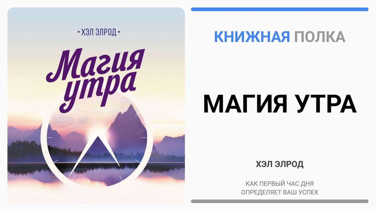 📚 «Магия утра» - Хэл Элрод «Магия утра» - это вдохновляющая книга, которая предлагает читателям изменить свою жизнь с помощью утренних ритуалов. Хэл Элрод делится своей личной историей и опытом, показывая, как простые изменения в утренней рутины могут привести к значительным улучшениям в различных аспектах жизни. Хэл Элрод - мотивационный спикер и автор, который пережил множество сложностей, включая тяжелую автокатастрофу. Он использует свой опыт, чтобы вдохновить других и помочь им находить силы для преодоления трудностей. Основные идеи книги: - Утренние ритуалы. Элрод предлагает метод, который он называет «S.A.V.E.R.S.», что расшифровывается как: - S - Silence (Тишина): медитация или осознанность - A - Affirmations (Аффирмации): позитивные утверждения - V - Visualization (Визуализация): представление своих целей - E - Exercise (Физические упражнения): активность для бодрости - R - Reading (Чтение): изучение вдохновляющих книг - S - Scribing (Письмо): ведение дневника Элрод дели