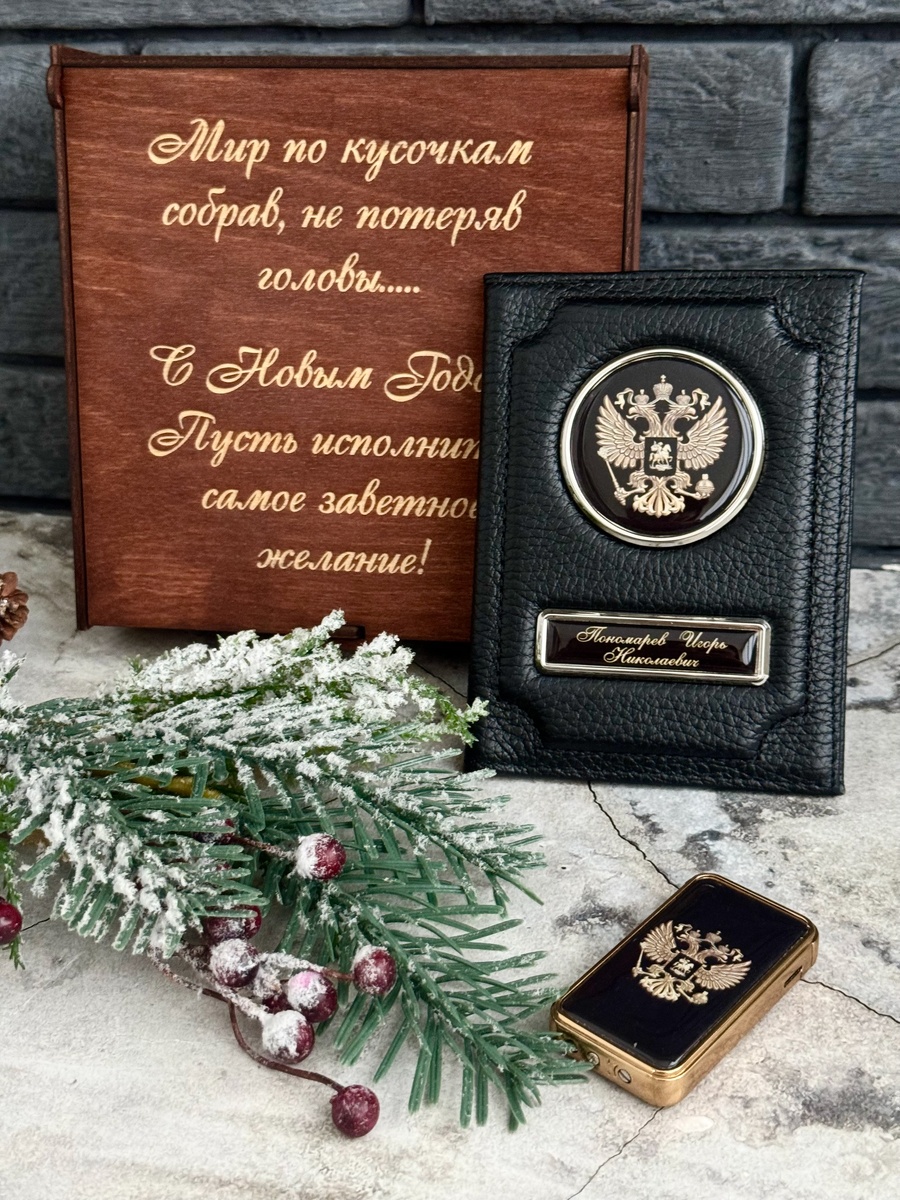 Подарочный набор с именной обложкой и зaжигaлкой ✔ Именная обложка на паспорт ✔ Зaжигалкa с гербом и инициалами ✔️Деревянная коробочка с любой вашей гравировкой