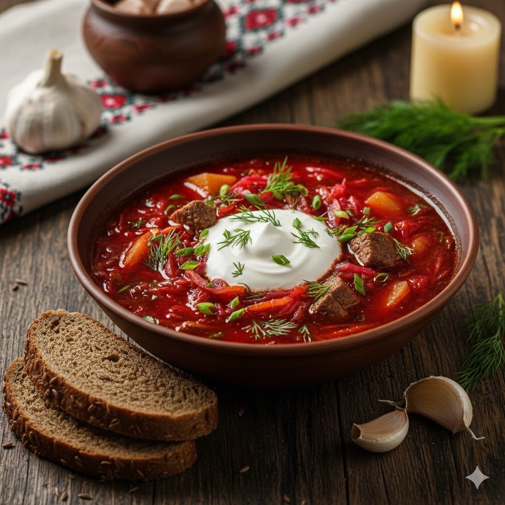 Насыщенный, ароматный и ярко-красный суп, который становится только вкуснее на второй день. Ингредиенты: Говядина (на кости или грудинка) — 500 г (для бульона) Вода — 3–3.5 л Свекла — 2–3 шт. (средние) Капуста белокочанная — ½ кочана Картофель — 4–5 шт. Морковь — 1 шт. Лук репчатый — 1–2 шт. Томатная паста — 3 ст. л. Уксус 9% или лимонный сок — 1 ст. л. (для сохранения цвета свеклы) Чеснок — 3–4 зубчика Сало (по желанию) — 30 г (для заправки с чесноком) Лавровый лист, соль, перец, растительное масло — По вкусу Сметана и зелень — Для подачи Пошаговое приготовление: Бульон: Говядину залейте холодной водой, доведите до кипения. Обязательно снимите пену, уменьшите огонь, посолите и варите 1.5–2 часа до мягкости мяса. Готовое мясо выньте, а бульон процедите. Картофель: Картофель нарежьте кубиками и отправьте вариться в процеженный бульон. Зажарка (Пассеровка): Свеклу и морковь натрите на крупной терке. Лук нарежьте кубиками. В сковороде разогрейте масло (или сало). Обжарьте лук до прозр
