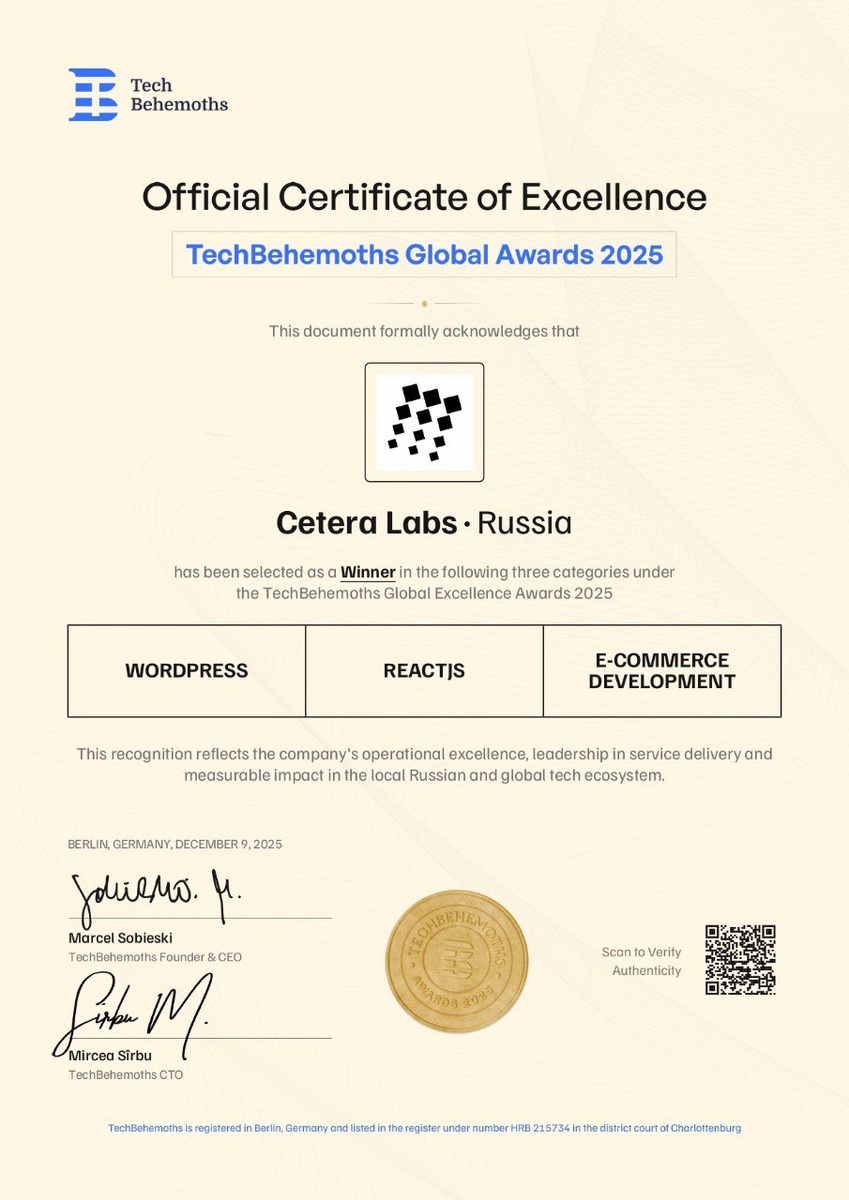 Получили новый диплом от TechBehemoths Global Awards 2025. Награда присуждена в трех категориях: WordPress, ReactJS и разработка электронной коммерции.