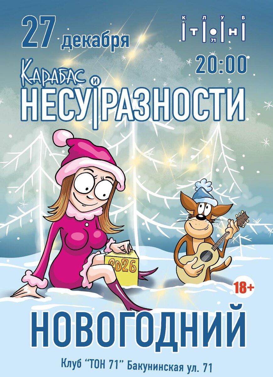 27 декабря Большой Новогодний концерт Карабас и НЕСУ|РАЗНОСТИ Билеты: 2712.ticketscloud.org 20:00 Весело проводим уходящий год, чтобы Новый пришёл радостным и счастливым! Клуб Тон71 | Концертный клуб 18+ Москва, ул. Бакунинская 71 #несуразности #новыйгод #новогодний