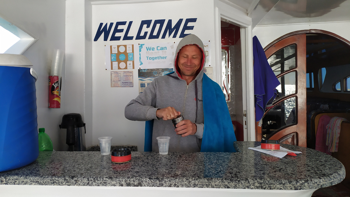 Решили мы развлечь себя морской прогулкой на остров Гифтун!Купили экскурсию,сели в порту на яхту и поплыли наслаждаться морскими просторами и свежим воздухом!Даже дельфинов видели в море! На яхте можно сделать себе чай,кофе, ну а обед будет попозже! Серёга-бармен! По пути на остров Гифтун делали несколько остановок чтобы желающие могли поплавать или посноркать.Также предлагали покататься на таблетке и банане!Мы не плавали,потому что вода была бодрящая да и в открытом море ветерок!А вот сидеть на палубе в кофточке и ещё завернувшись в полотенце было хорошо!Цвет воды насыщенный,яркое солнце и проплывающие мимо корабли-красота да и только! Остров Большой Гифтун отлично виден с нашего отельного пляжа!Малый Гифтун находится позади него!На островах ничего нет кроме пляжей и нескольких ресторанов!Вода у берега невероятно красивая,чистая и прозрачная!Видимость воды до 20 метров,поэтому сюда хорошо приезжать плавать с маской!В сезон она здесь хорошо прогревается,а вот под конец декаб