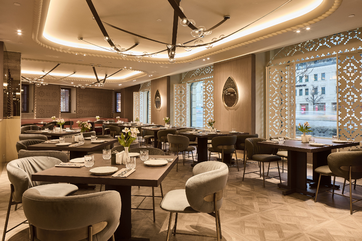 Казалось бы, московскую публику сдержанной бежевой гаммой уже не удивить, но авторы проекта удачно вплели в оформление русские мотивы в современной интерпретации, добавив индивидуальности и настроения.