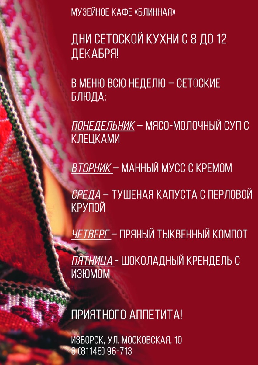 В музее-заповеднике «Изборск» продолжаются Дни сетоской культуры 🪆 🥞 Мероприятия, посвященные малочисленному коренному народу сето, проходят в Музее-усадьбе сето в деревне Сигово и в кафе «Блинная». Здесь всю неделю можно попробовать блюда традиционной кухни сето. Оставайтесь с нами #НашаПсковскаяобласть