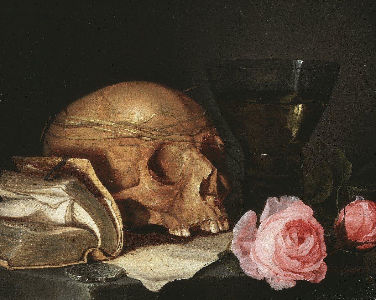 Череп, увядающие цветы, старые книги, оплывшие свечи. Такие натюрморты стали очень в ходу в 17 веке в Голландии, Фландрии, дальше везде. Этот жанр называется vanitas. От фразы из Книги Экклезиаста – Vanitas vanitatum et omnia vanitas. Все суета сует и всячекая суета. (Кстати, vanity, тщеславие, этого же корня.) Тут натюрморт с розами и бокалом, автор Ян Давидс де Хем, он вообще был корифеем «ванитасов»: Жанр родился в Лейдене, протестантском центре Европы. Протестанты были за скромную жизнь, полную трудов и простых радостей. Эти черепа и цветы говорили: все преходяще, все тлен, помни об этом. Люди вешали картины дома, спрос был огромный, художники писали их одну за одной. Посмотрите на роскошный – вроде бы – натюрморт, который написал забытый нынче Питер Буль, живший в Антверпене. Его можно долго рассматривать, в этом жанре любой предмет имеет значение. Золото, бубен, оружие – все будто на свалке. Богатства, развлечения, войны смешны и ничтожны. И отдельно – драгоценная митра, привет