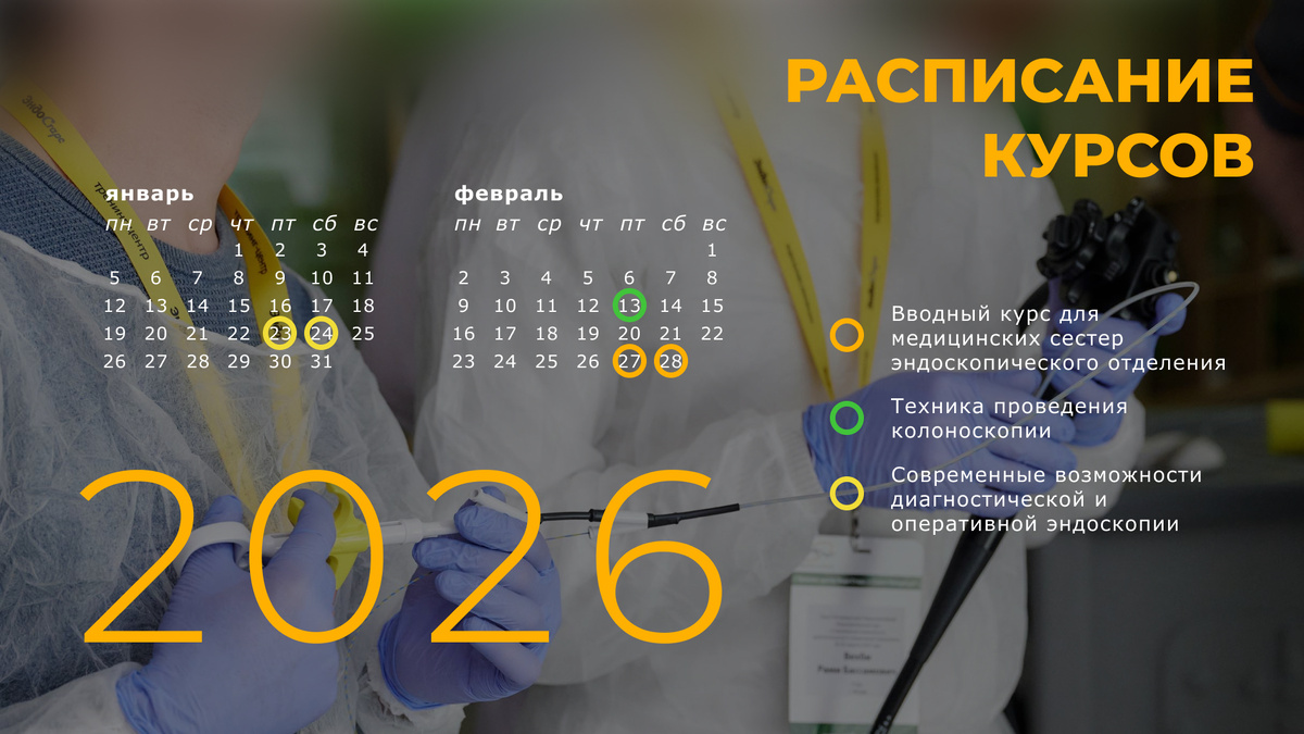 Анонсируем новое расписание курсов тренинг центра «Эндо Старс». В начале 2026 года планируется проведение двух курсов для врачей-эндоскопистов и одного для медицинских сестер. Расписание курсов:
