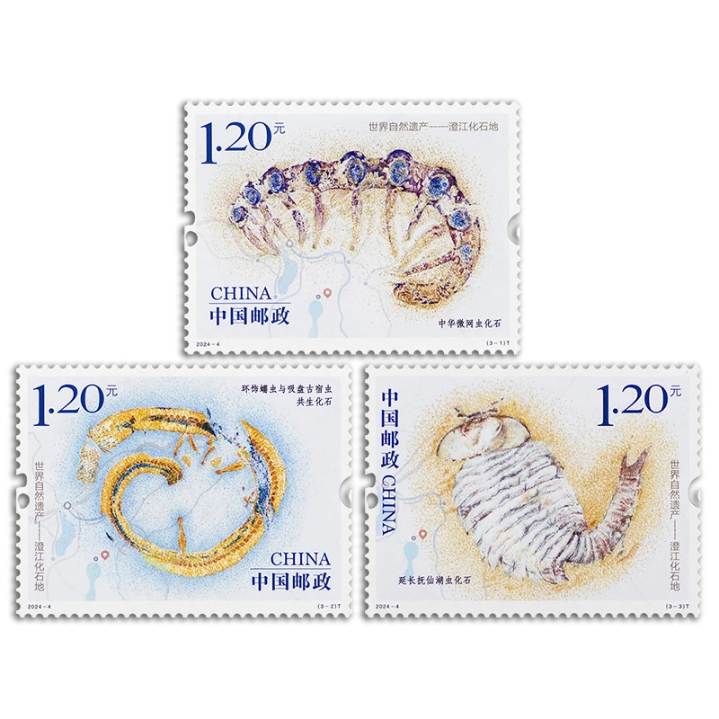 Дорогие друзья, добрый день! Сегодня мы хотим показать вам кое-что из нашей палеонтологической почты. Смотрите, какие замечательные марки пришли к нам из Китая! Редкий случай, когда нам сразу прислали всю серию! Это серия «Всемирное природное наследие — Геопарк Чэнцзян», которая вышла в 2024 году. Геопарк Чэнцзян расположен в провинции Юньнань (Китай) и известен своими уникальными окаменелостями кембрийского периода, которые считаются одними из самых древних и хорошо сохранившихся в мире. Это место с 2012 года входит в список Всемирного наследия. На первой марке мы видим микродиктиона (Microdictyon sinicum) - животное, которое относится к лобоподам. Его современными родственниками являются онихофоры и тихоходки. Находки животных этой группы сделаны по всему миру, включая Россию. Однако образцы с сохранившимися отпечатками мягких тканей известны только из Китая. На второй марке не один, а сразу два вида живых существ. Это головохоботный червь крококосмия (Cricocosmia jinningensis), на к