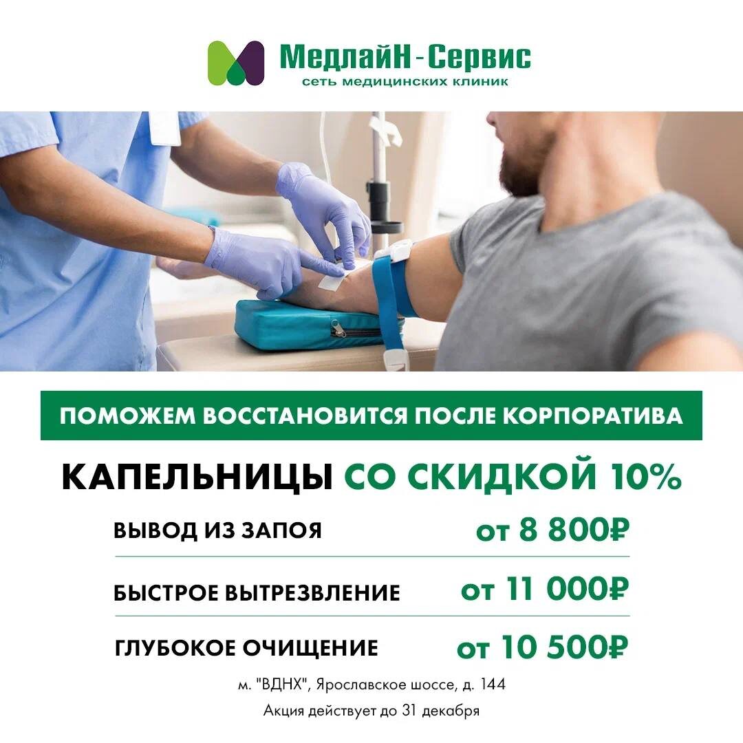 После корпоративов тоже нужно заботиться о себе! В МедлайН-Сервис мы поможем вам быстро восстановиться и вернуть бодрость после праздников. КАПЕЛЬНИЦЫ СО СКИДКОЙ 10% Поддержка, которая действительно работает. 1) Вывод из запоя - от 8 800 ₽ Комплексная помощь под наблюдением специалистов. 2) Быстрое вытрезвление - от 11 000 ₽ Снятие тревожности, тошноты, головной боли и сильной интоксикации. 3) Глубокое очищение - от 10 500 ₽ Восстановление водного баланса, укрепление иммунитета, детокс. Мы работаем бережно и профессионально. Помогаем чувствовать себя лучше уже в день обращения! м. ВДНХ, Ярославское шоссе, д. 144