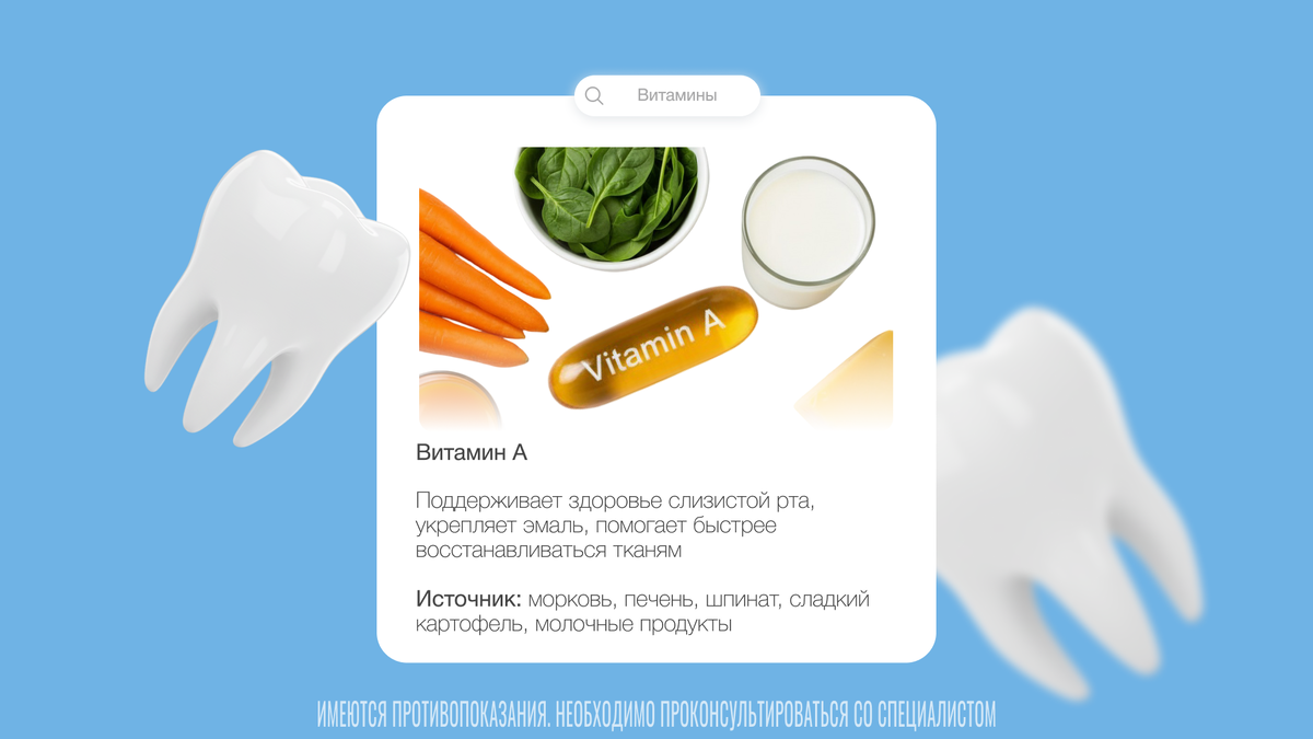 Витамин А Что делает: поддерживает слизистую рта, укрепляет эмаль. Где найти: морковь, шпинат, сладкий картофель, печень, молочные продукты. Витамин D Что делает: помогает усваивать кальций и фосфор, укрепляет зубы, снижает риск кариеса. Где найти: жирная рыба (лосось, сельдь), яичный желток, молоко, сливочное и оливковое масло. Кальций Что делает: основной строительный материал зубов и костей. Где найти: молоко, йогурт, сыр, зелёные листовые овощи. Фосфор Что делает: вместе с кальцием формирует прочную эмаль. Где найти: мясо, рыба, орехи, бобовые, яйца. Витамин C Что делает: укрепляет дёсны, поддерживает сосуды, способствует заживлению тканей. Где найти: цитрусовые, киви, болга