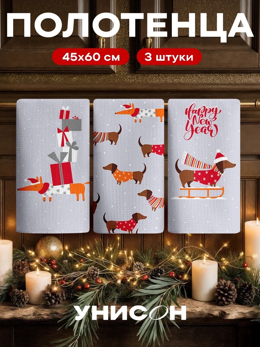Новогодние полотенца кухонные набор 45х60 3 шт (Таксы)