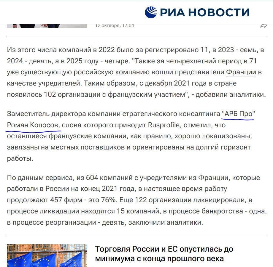Уход французского бизнеса из России: что на самом деле произошло и что будет дальше 🇷🇺🇫🇷 📝Дал комментарий для РИА Новости по поводу ухода французских компаний. В новостях пишут «французские компании ушли из России». На практике это не исчезновение французского бизнеса, а его переформатирование. 📍Danone ушла из России только после периода госуправления и продажи активов Вамин Р (сейчас Health & Nutrition), фактически потеряв возможность вернуться, хотя рынок оставался для неё высокомаржинальным. 📍Decathlon не хлопал дверью — российский бизнес продали локальному игроку и перезапустили под брендом Desport, потому что при разрыве цепочек поставок и низкой локализации старую модель уже было не потянуть. 📍Leroy Merlin передал российский бизнес локальному менеджменту и сохранил сеть как действующий актив с высокой долей локальных закупок. В плане управления стало хуже - это почувствовали многие в рынке 📍Auchan публично подтверждает, что остаётся в России и продолжает работать,